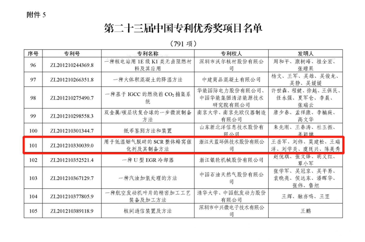 在剛剛揭曉的第二十三屆中國專利獎中,我司發明專利“用于低溫煙氣脫硝的SCR整體蜂窩催化劑及其制備方法”榮獲中國專利獎優秀獎。